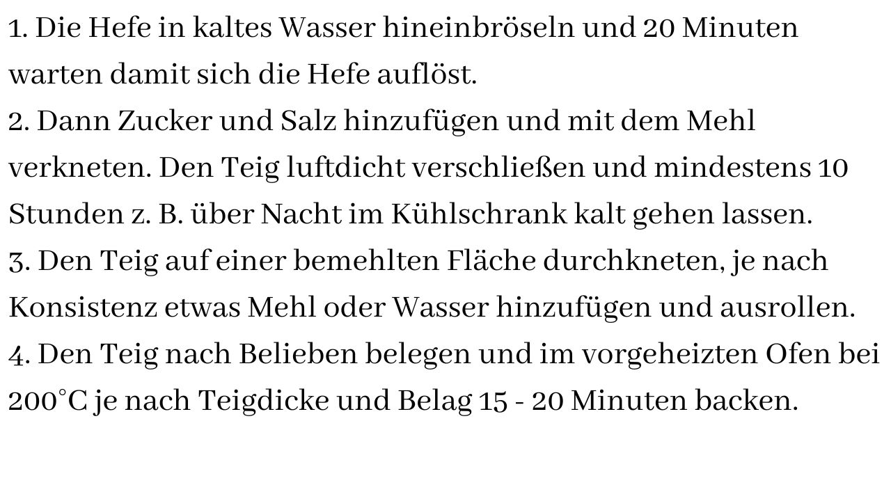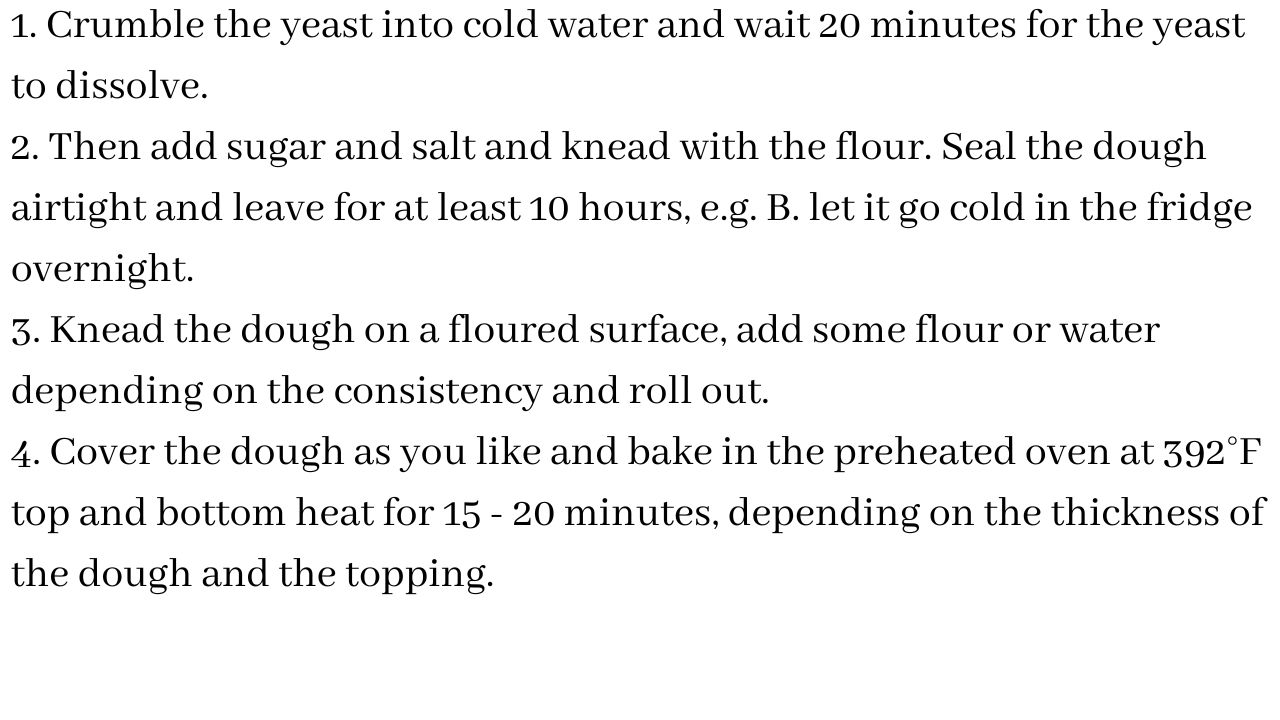 In general, the recipe is sufficient for 1 tray with medium-thick dough or for 2 flat pizzas. Please note that fresh yeast takes a long time to rise in order to achieve an optimal result. If you are not experienced in rolling out or have little time, you should use the pizza dough with dry yeast. Making the pizza dough yourself does not require a lot of time and work. If you are planning, you can quickly knead the dough the day before and let it rise overnight.