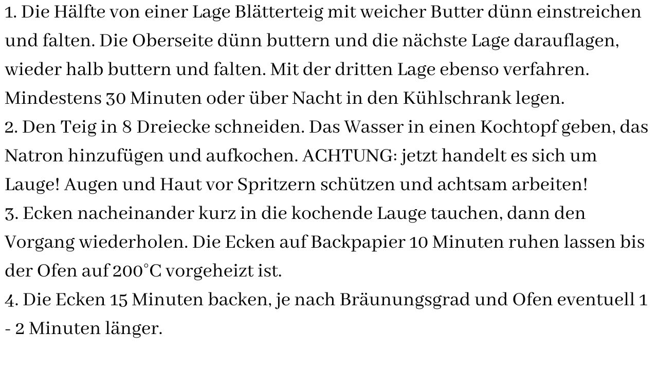 Rezept mit nur 3 Zutaten. Ganz einfach mit fertigem Blätterteig und einfach nur klasse. Gelaugter Blätterteig ist super lecker, selbstgemacht ist sowieso immer lecker und günstiger auch. Der angegebene Preis kann noch reduziert werden. Wie immer haben wir den günstigsten Preis vom Lieferservice Rewe und Picnic gewählt. Der Blätterteig ist aber noch etwas günstiger bei Aldi. Außerdem kann Natronlauge mindestens 3 Mal verwendet werden. Einfach in einer Glasflasche im Kühlschrank aufbewahren und wieder etwas sparen :-) ABER damit niemand versehentlich sich verletzt, bitte die Flasche kennzeichnen mit dem Symbol für "ätzende Stoffe" oder einfach das Wort oder ein Zeichen für "giftig" verwenden, dass ist für jedermann verständlich ist. Mit kleinen Kindern im Haus eine Kindersicherung verwenden oder ganz auf die Mehrfachverwendung verzichten. Wer es noch ein wenig schneller möchte, kann den Teig am Vorabend buttern und erspart sich am Morgen die 30 Minuten Wartezeit indem der Teig über Nacht kühlt!