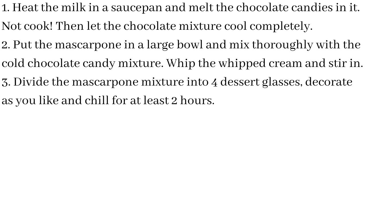 The recipe is easy, with little work, but some chilling time. The dessert can also be prepared the day before, but the decoration should not be left in the fridge overnight. Depending on the decoration, the end result could not look more beautiful. If you are not talented when it comes to decoration, you can simply leave it at a chocolate bonbon and / or dab of cream. With this recipe, the consistency becomes relatively firm again. Since the chocolate bonbons don't have much solid content, I wouldn't use more than 100 ml of milk. It's a bit dependent on personal preference.