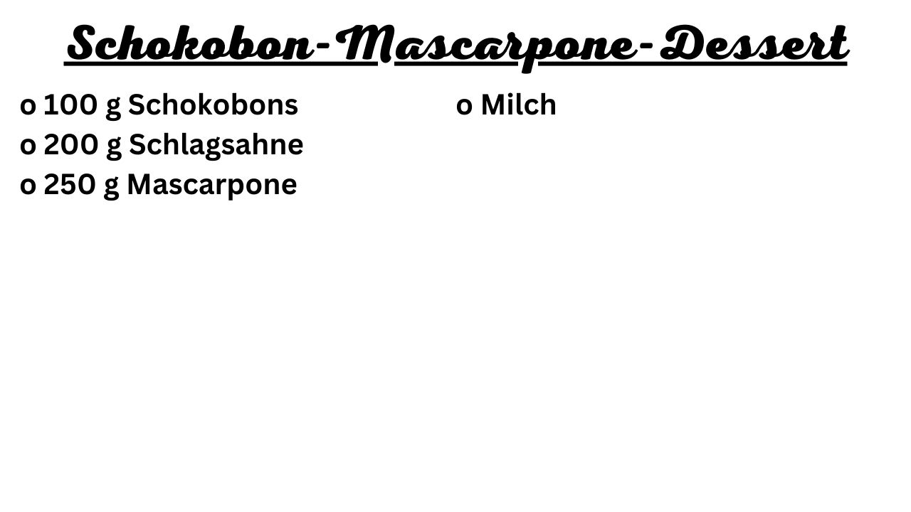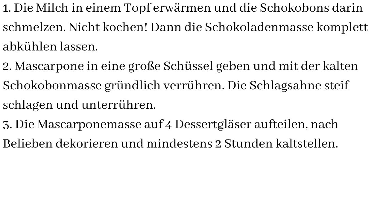 Das Rezept ist einfach, mit wenig Arbeitsaufwand, aber einer gewissen Kühlzeit. Das Dessert lässt sich auch prima am Vortag zubereiten, jedoch die Dekoration sollte nicht über Nacht im Kühlschrank stehen. Je nach Dekoration könnte das Endergebnis nicht mehr schön aussehen. Wer nicht talentiert ist in Sachen Dekoration kann es ganz schlicht bei einem Schokobon und / oder Sahnetupfer belassen. Bei diesem Rezept wird die Konsistenz wieder relativ fest. Da die Schokobons nicht viel festen Anteil haben würde ich nicht mehr als 100 ml Milch benutzen. Es ist ein wenig abhängig von den persönlichen Vorlieben.