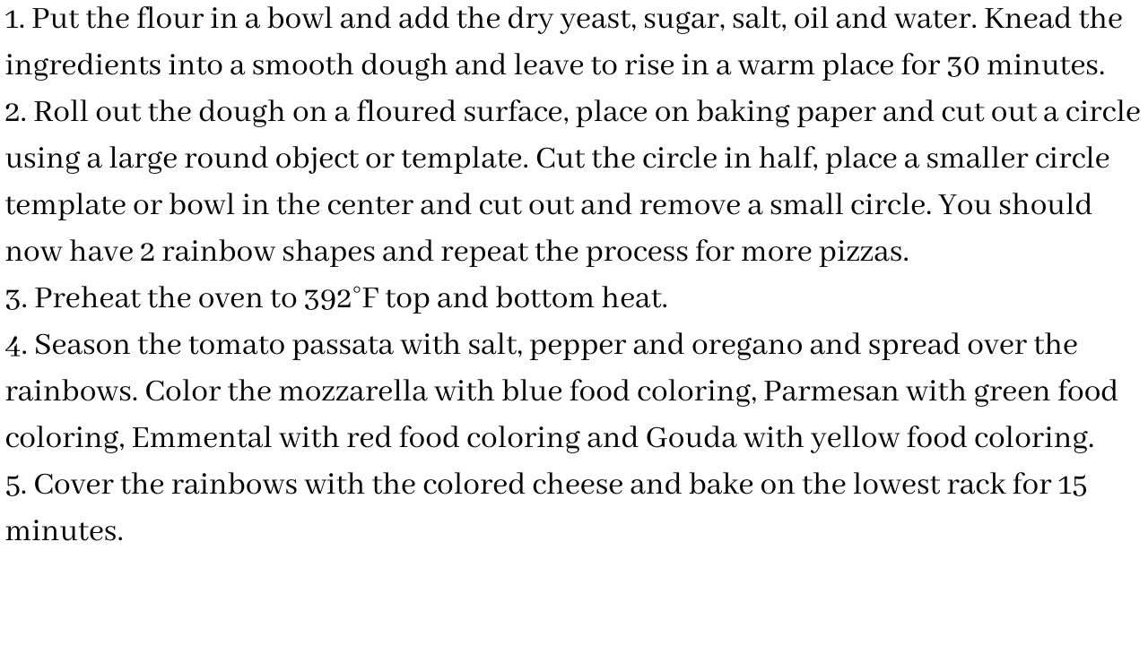 A rainbow pizza, all the little fairies, goblins and unicorns will freak out. Yes, you've noticed, the recipe is great for theme parties and children's birthday parties or just because a rainbow brightens up a gloomy day. In principle, it is a four-cheese pizza and of course you can also choose other types of cheese than those specified in the recipe. However, cheese is usually yellow and yellow with blue gives green. So we recommend mixing the blue color with white cheeses like mozzarella. If you use Parmesan, you should mix it with green color, as it gets darkest when baking.
