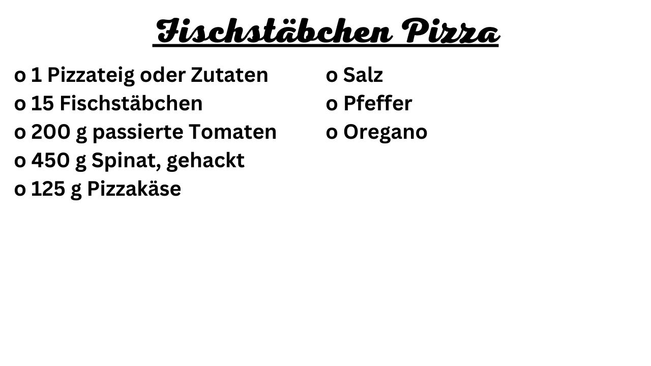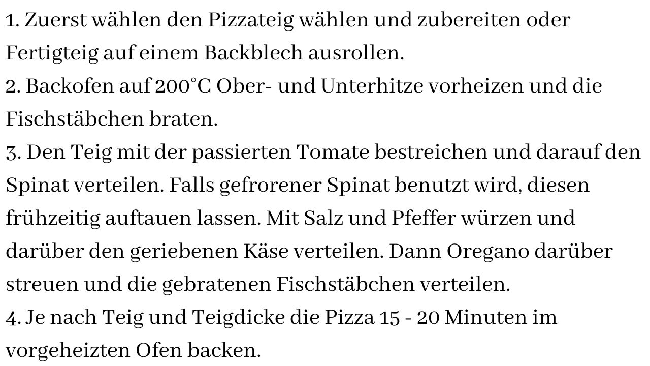 3. Den Teig mit der passierten Tomate bestreichen und darauf den Spinat verteilen. Falls gefrorener Spinat benutzt wird, diesen frühzeitig auftauen lassen. Mit Salz und Pfeffer würzen und darüber den geriebenen Käse verteilen. Dann Oregano darüber streuen und die gebratenen Fischstäbchen verteilen.