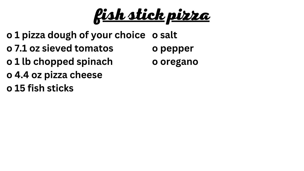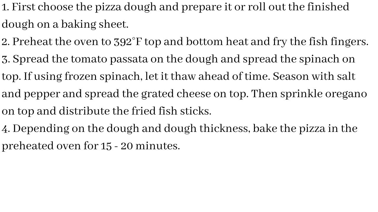 3. Spread the tomato passata on the dough and spread the spinach on top. If using frozen spinach, let it thaw ahead of time. Season with salt and pepper and spread the grated cheese on top. Then sprinkle oregano on top and distribute the fried fish sticks.