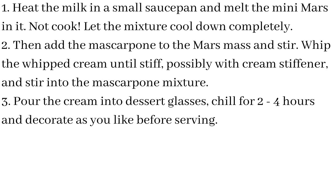 1. Heat the milk in a small saucepan and melt the mini Mars in it. Not cook! Let the mixture cool down completely.