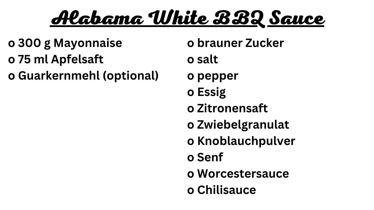 Tolles und einfaches Rezept. Es gibt viele Rezepte für eine Alabama White BBQ Sauce, aber die meisten sind sehr essighaltig und schmecken wie ein normales Salatdressing. Wir haben uns für eine Variante wie von Grate Goods entschieden, die fruchtig, süß, sauer und scharf ist, aber kein Aroma dominiert sondern alle Aromen miteinander harmonieren. Deshalb haben wir für diese Variante auf Apfelsaft und einen reduzierten Essiganteil gesetzt. Das Guarkernmehl muss nicht zwingend verwendet werden, da es nur zum verdicken benötigt wird und der Sauce ein wenig Cremigkeit verleiht. Ohne Guarkernmehl ist die BBQ Sauce wie alle anderen Rezepte von der Konsistenz her wie ein Dressing. Die Sauce passt zu BBQ, Burger, Hähnchen und auch zu Meeresfrüchten.