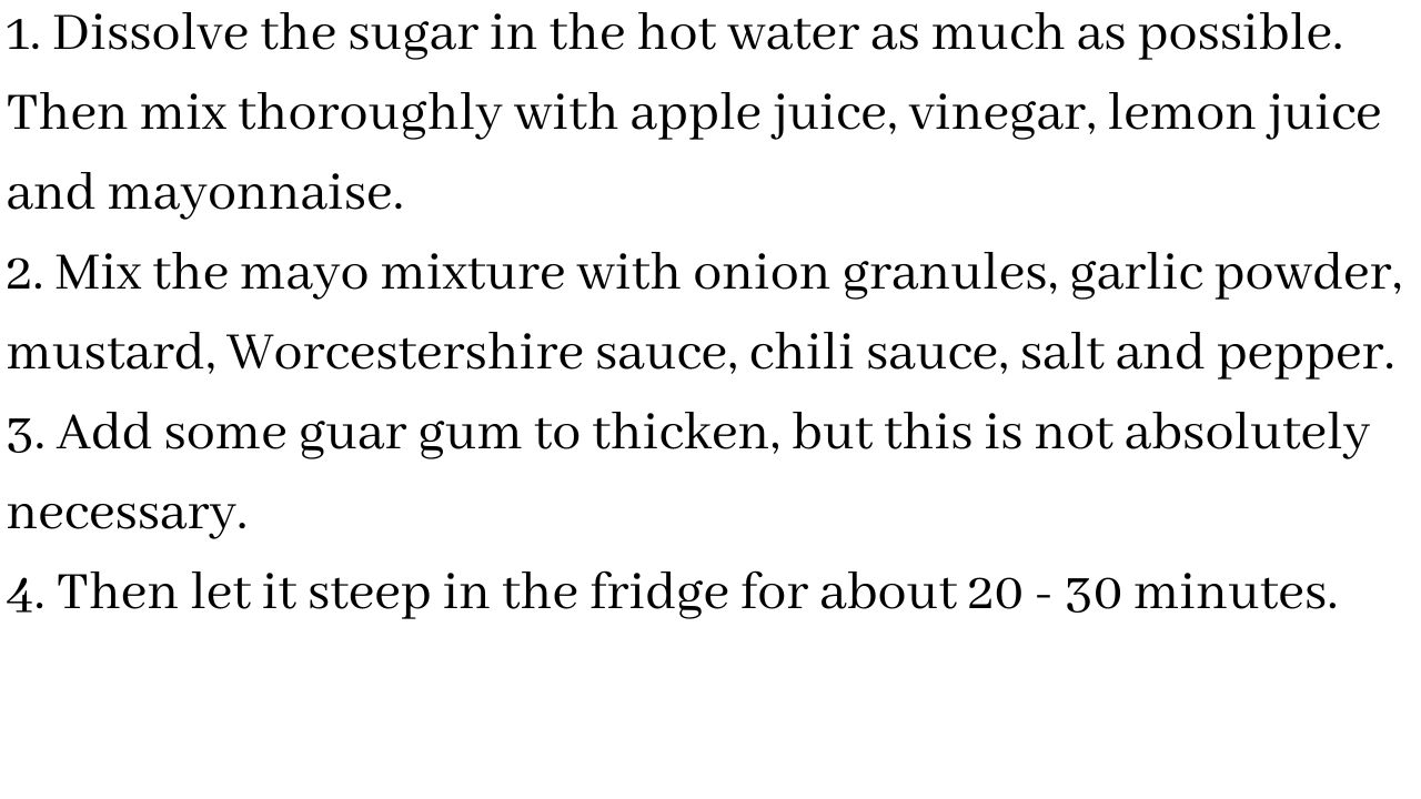 1. Dissolve the sugar in the hot water as much as possible. Then mix thoroughly with apple juice, vinegar, lemon juice and mayonnaise.