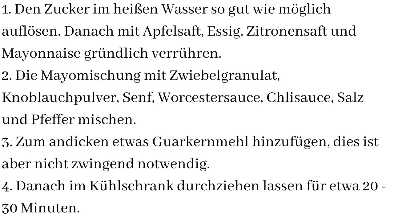 1. Den Zucker im heißen Wasser so gut wie möglich auflösen. Danach mit Apfelsaft, Essig, Zitronensaft und Mayonnaise gründlich verrühren.