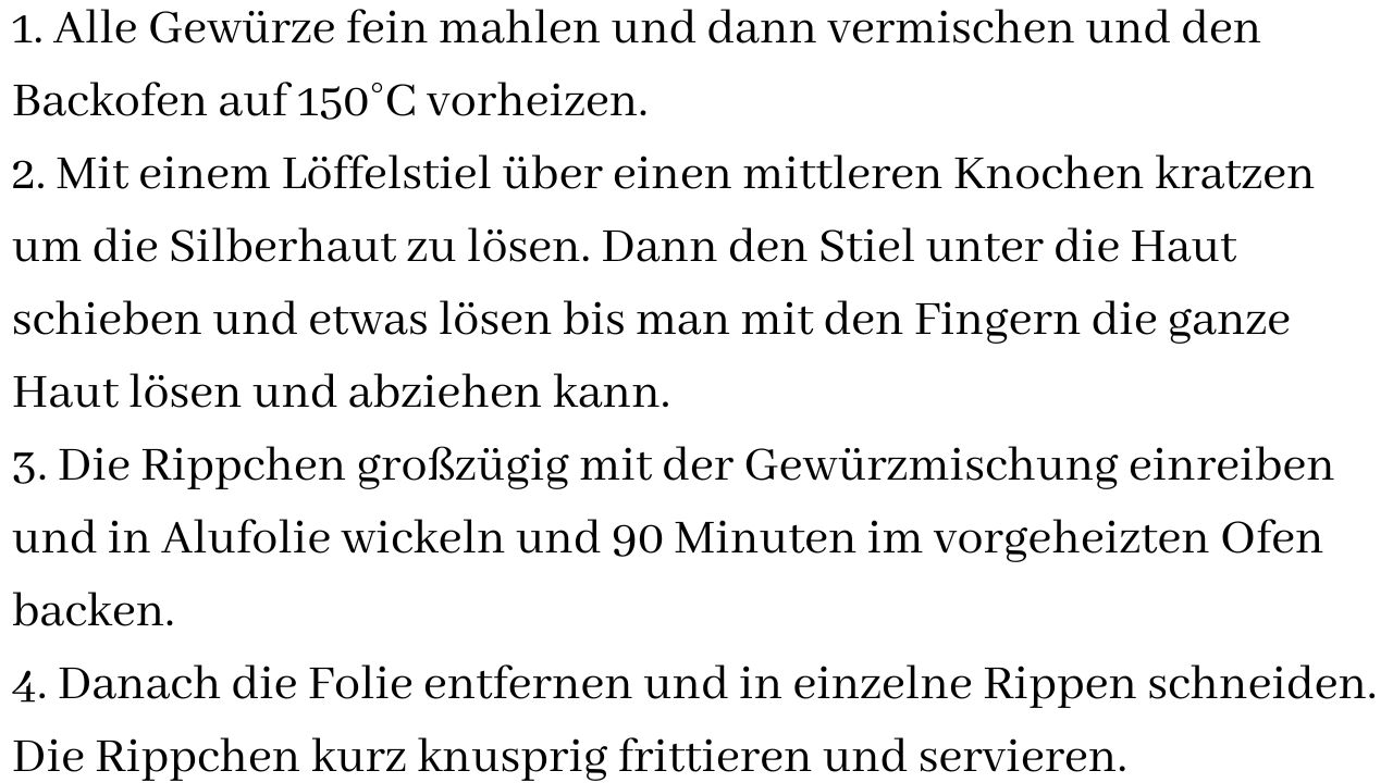 Actually, only my son eats spareribs here, but this recipe makes me a sparerib fan too. No wobbly spots of fat, everything is deliciously crispy thanks to double frying. It's also super practical if you can't stand at the grill and want to watch soccer or football, for example. Carry out the first cooking process in the smoker or oven and then fry briefly in the deep fryer until crispy.