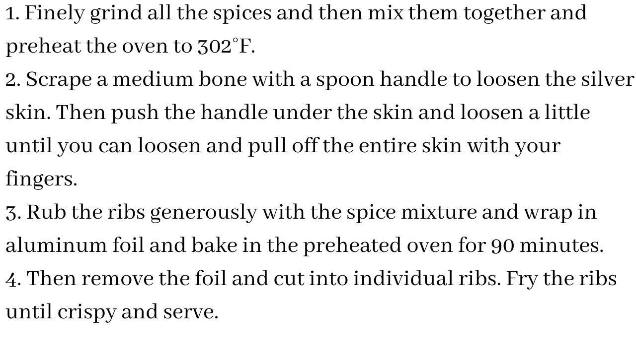 3. Rub the ribs generously with the spice mixture and wrap in aluminum foil and bake in the preheated oven for 90 minutes.
