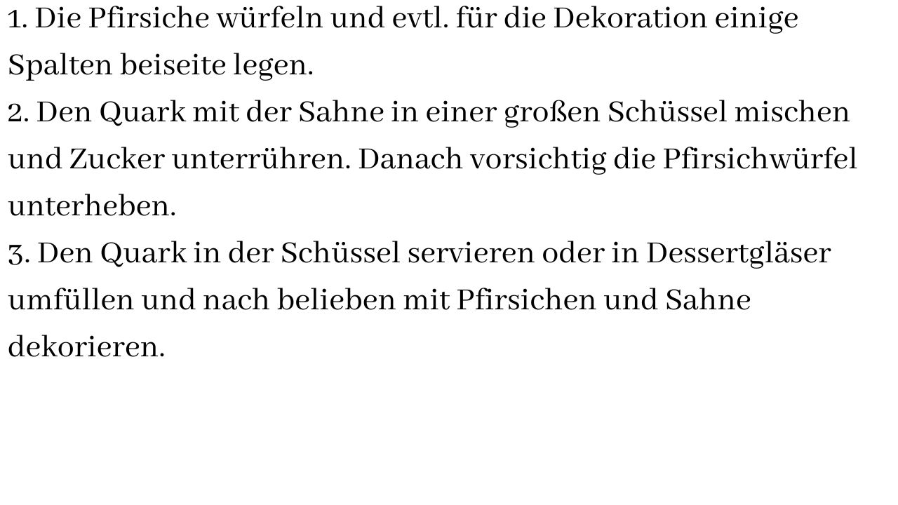 3. Den Quark in der Schüssel servieren oder in Dessertgläser umfüllen und nach belieben mit Pfirsichen und Sahne dekorieren.