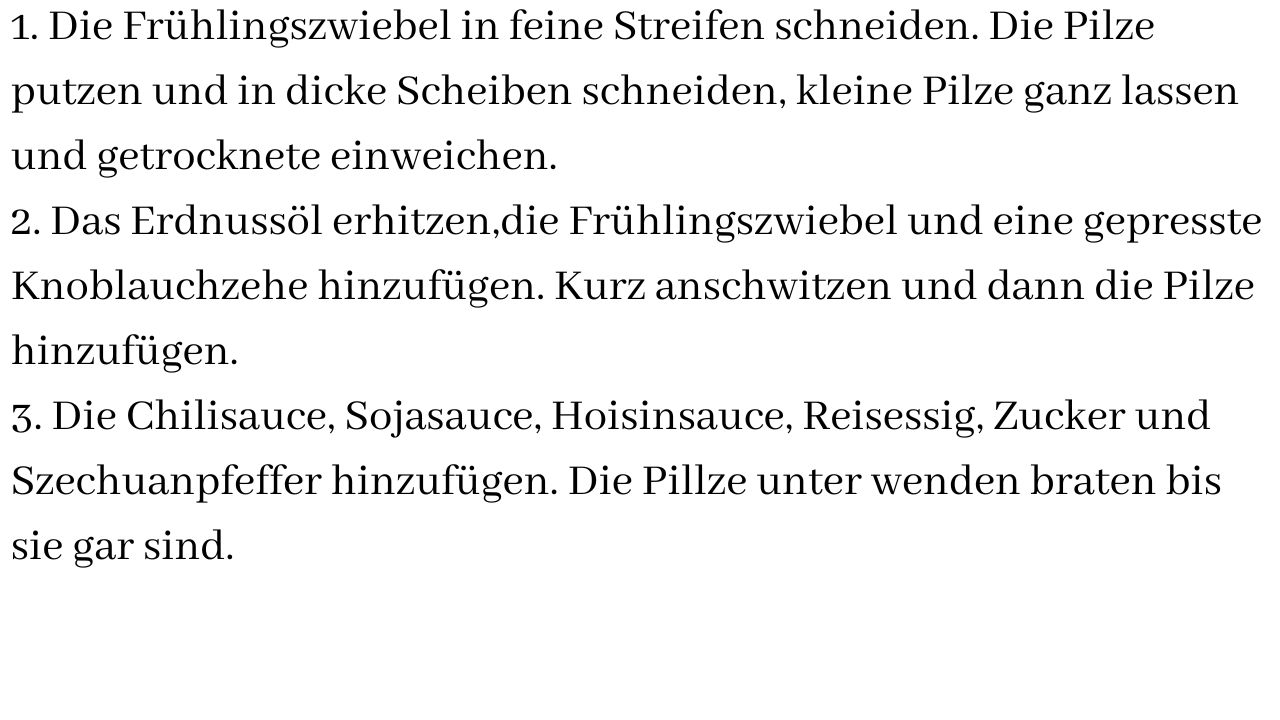 3. Die Chilisauce, Sojasauce, Hoisinsauce, Reisessig, Zucker und Szechuanpfeffer hinzufügen. Die Pillze unter wenden braten bis sie gar sind.