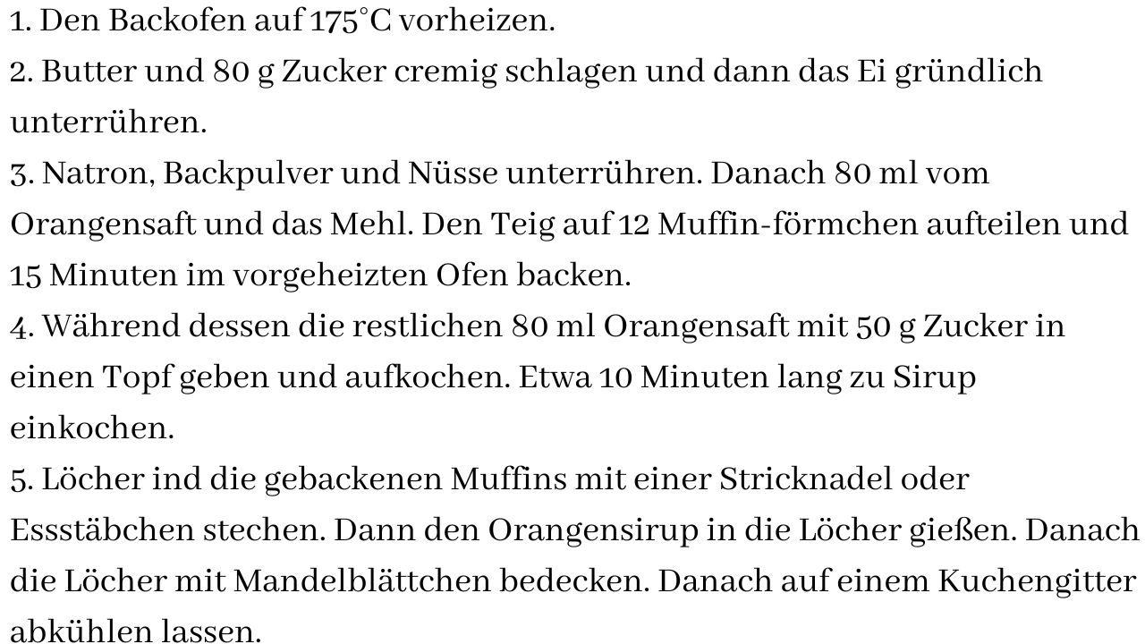3. Natron, Backpulver und Nüsse unterrühren. Danach 80 ml vom Orangensaft und das Mehl. Den Teig auf 12 Muffin-förmchen aufteilen und 15 Minuten im vorgeheizten Ofen backen.