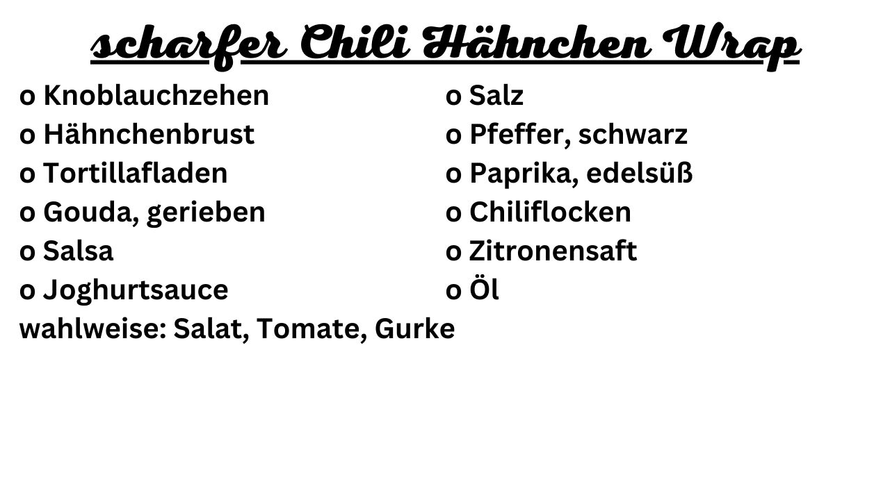 Einfacher kalorienarmer Wrap mit scharfem Chilihähnchen. Abgesehen von der Marinierzeit ein schnelles Rezept. Für die Joghurtsauce empfehlen wir unser Rezept: türkische Joghurtsauce