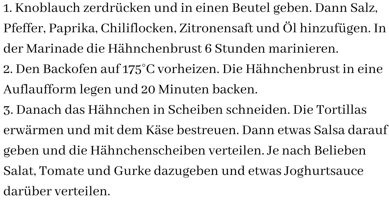 3. Danach das Hähnchen in Scheiben schneiden. Die Tortillas erwärmen und mit dem Käse bestreuen. Dann etwas Salsa darauf geben und die Hähnchenscheiben verteilen. Je nach Belieben Salat, Tomate und Gurke dazugeben und etwas Joghurtsauce darüber verteilen.