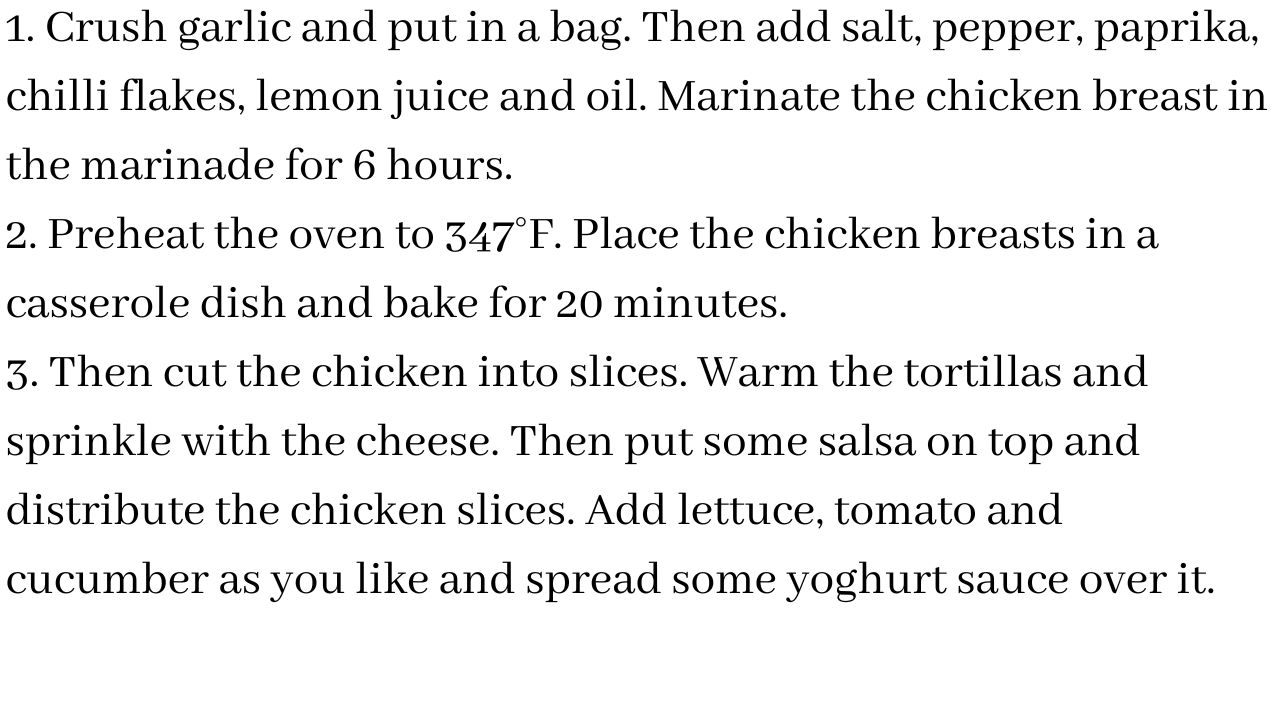 1. Crush garlic and put in a bag. Then add salt, pepper, paprika, chilli flakes, lemon juice and oil. Marinate the chicken breast in the marinade for 6 hours.
