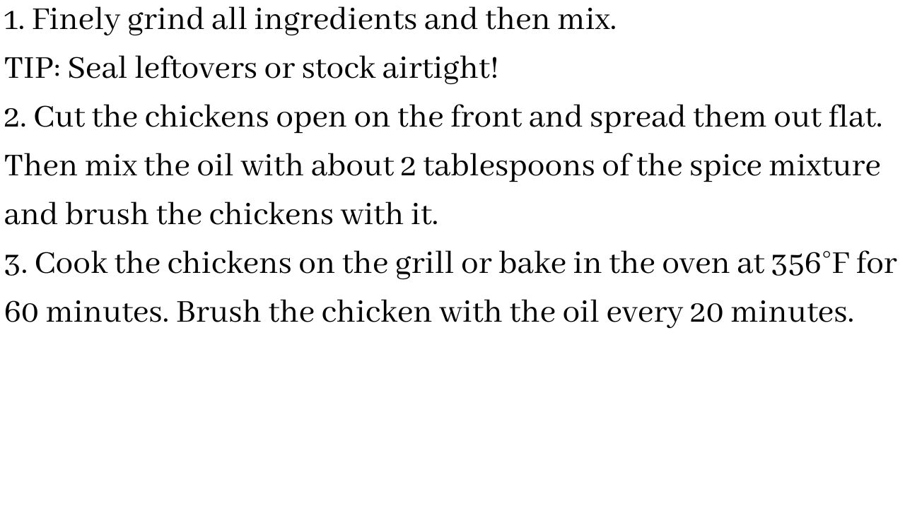 3. Cook the chickens on the grill or bake in the oven at 356°F for 60 minutes. Brush the chicken with the oil every 20 minutes.