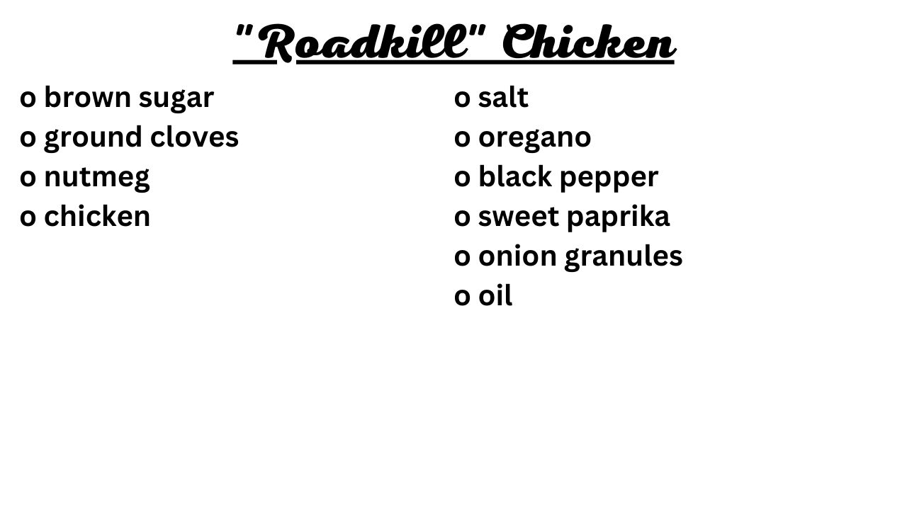 "Roadkill" erinnert an das amerikanische Hot Road BBQ, bei dem frisch überfahrene Tiere mitgenommen werden und gegrillt werden. Das Roadkill Chicken jedoch erhält seinen Namen durch die Optik, es sieht überfahren aus, jedoch geht es hierbei darum dass es auf dem offenen Feuer durch das einseitige Aufschneiden schneller durchgaren soll. Das Hähnchen muss aber nicht zwangsläufig auf dem Grill zubereitet werden sondern kann auch ganz regulär im Backofen gegart werden.