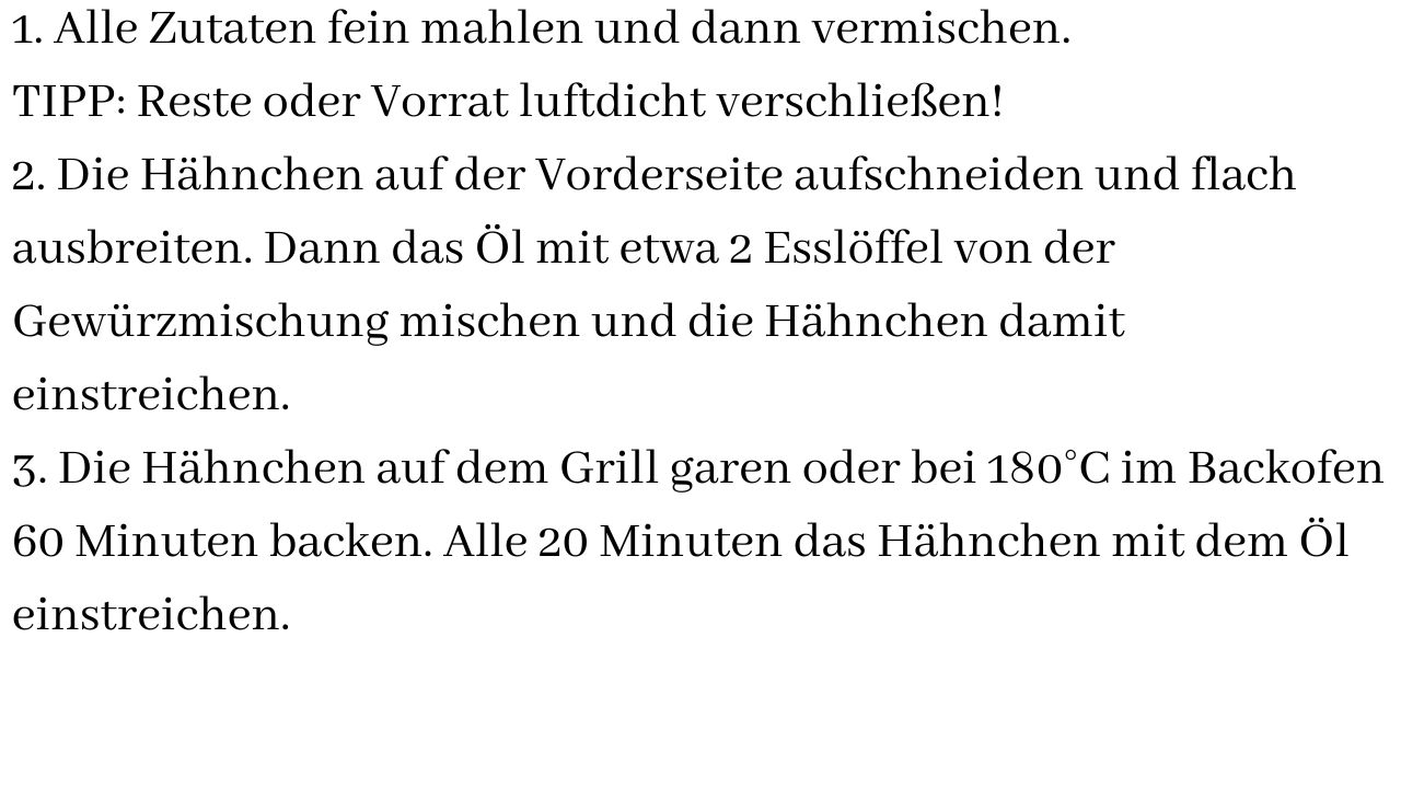 Die Gewürzmischung kann als Trockenrub aber auch mit Öl gemischt werden. Falls Reste übrig bleiben, diese bitte luft- und lichtdicht aufbewahren!