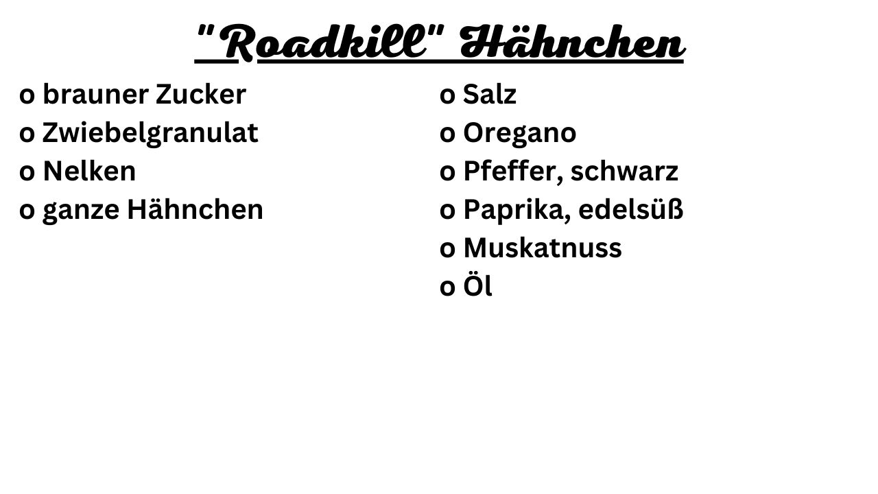 "Roadkill" is reminiscent of the American Hot Road BBQ, where animals that have just been run over are taken away and grilled. The roadkill chicken, however, gets its name from the look, it looks overrun, but the point here is that it should cook faster on the open fire by cutting it open on one side. The chicken does not necessarily have to be prepared on the grill, but can also be cooked in the oven as usual.