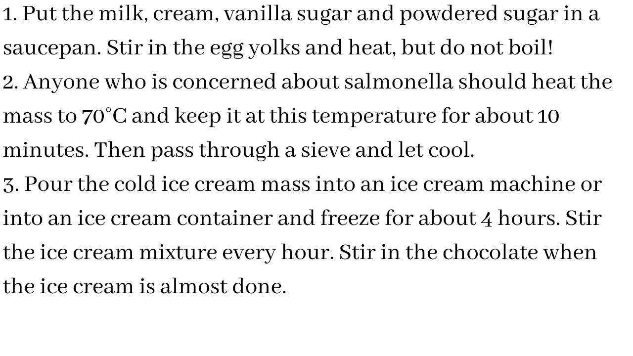 3. Pour the cold ice cream mass into an ice cream machine or into an ice cream container and freeze for about 4 hours. Stir the ice cream mixture every hour. Stir in the chocolate when the ice cream is almost done.