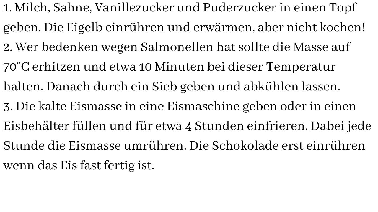 3. Die kalte Eismasse in eine Eismaschine geben oder in einen Eisbehälter füllen und für etwa 4 Stunden einfrieren. Dabei jede Stunde die Eismasse umrühren. Die Schokolade erst einrühren wenn das Eis fast fertig ist.