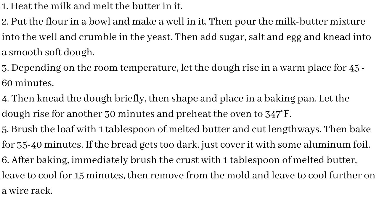 2. Put the flour in a bowl and make a well in it. Then pour the milk-butter mixture into the well and crumble in the yeast. Then add sugar, salt and egg and knead into a smooth soft dough.