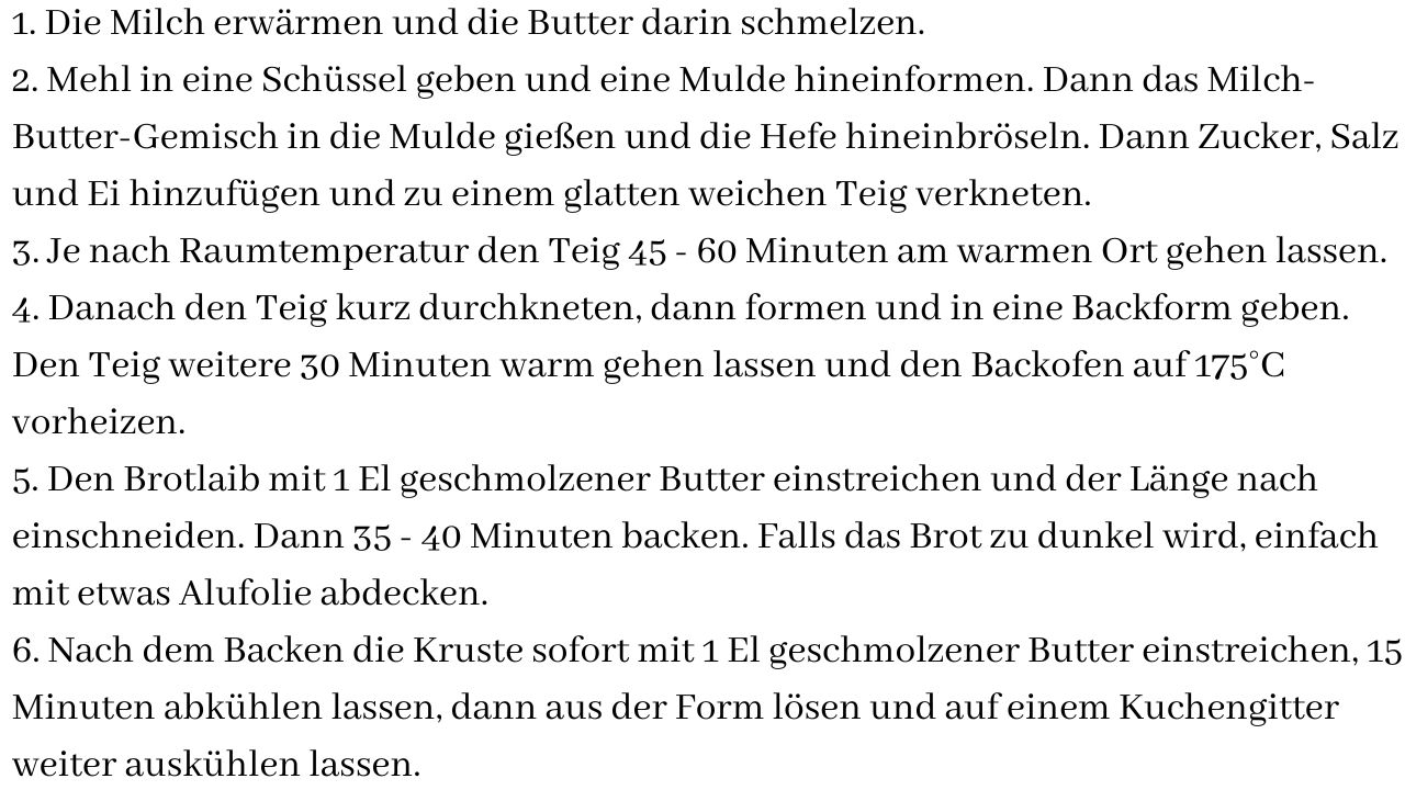 4. Danach den Teig kurz durchkneten, dann formen und in eine Backform geben. Den Teig weitere 30 Minuten warm gehen lassen und den Backofen auf 175°C vorheizen.