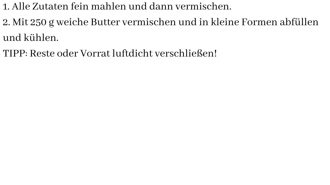 2. Mit 250 g weiche Butter vermischen und in kleine Formen abfüllen und kühlen.