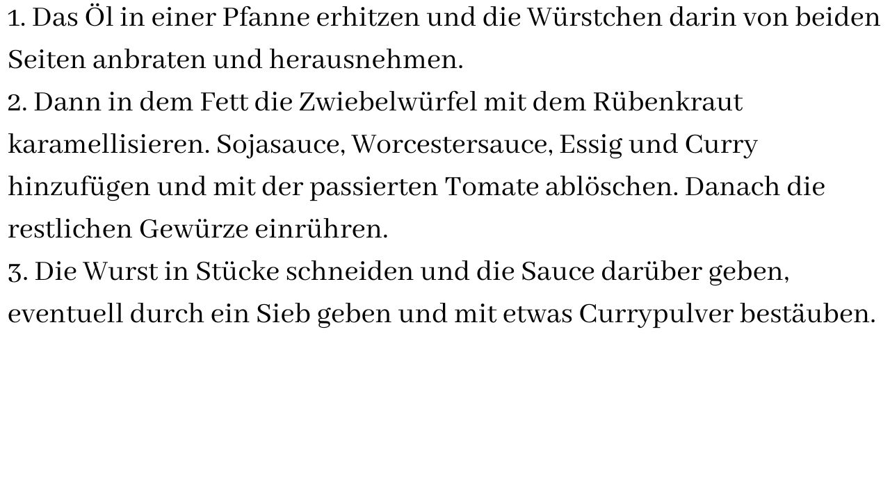 Wer es noch schneller und einfacher möchte kann Fertigprodukte benutzen: einfach Wurst mit etwas Öl anbraten, 2 Esslöffel Tomatenmark anschwitzen und mit einer Tasse Wasser ablöschen. Etwas 1 Tasse Curryketchup und eine halbe Tasse Tomatenketchup hinzufügen. Mit etwas Salz, Pfeffer, Paprika und 2 Teelöffel Curry abschmecken.