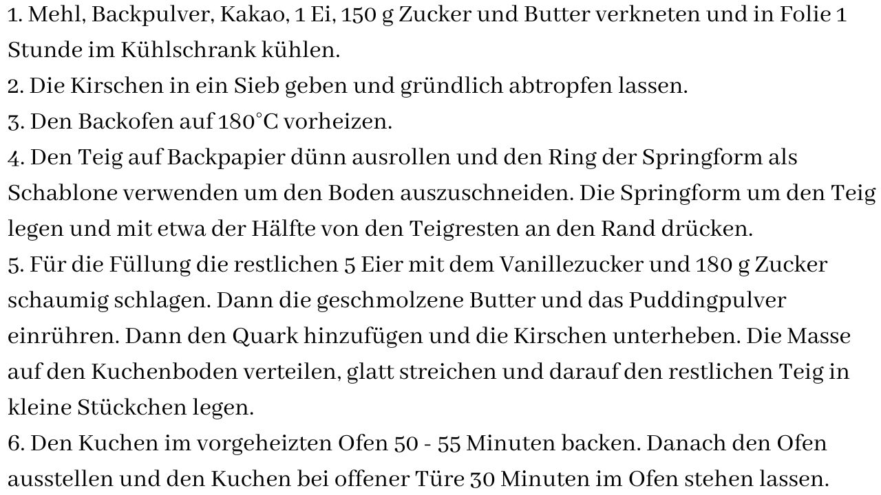 5. Für die Füllung die restlichen 5 Eier mit dem Vanillezucker und 180 g Zucker schaumig schlagen. Dann die geschmolzene Butter und das Puddingpulver einrühren. Dann den Quark hinzufügen und die Kirschen unterheben. Die Masse auf den Kuchenboden verteilen, glatt streichen und darauf den restlichen Teig in kleine Stückchen legen.