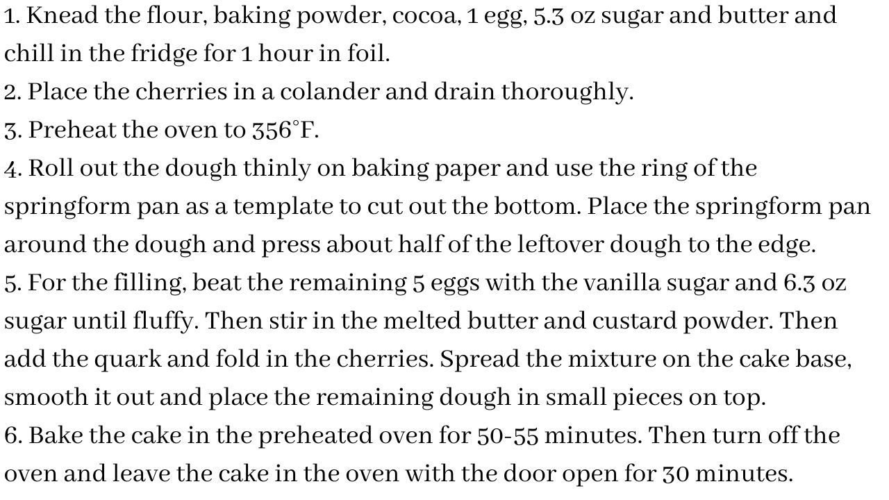 5. For the filling, beat the remaining 5 eggs with the vanilla sugar and 6.3 oz sugar until fluffy. Then stir in the melted butter and custard powder. Then add the quark and fold in the cherries. Spread the mixture on the cake base, smooth it out and place the remaining dough in small pieces on top.