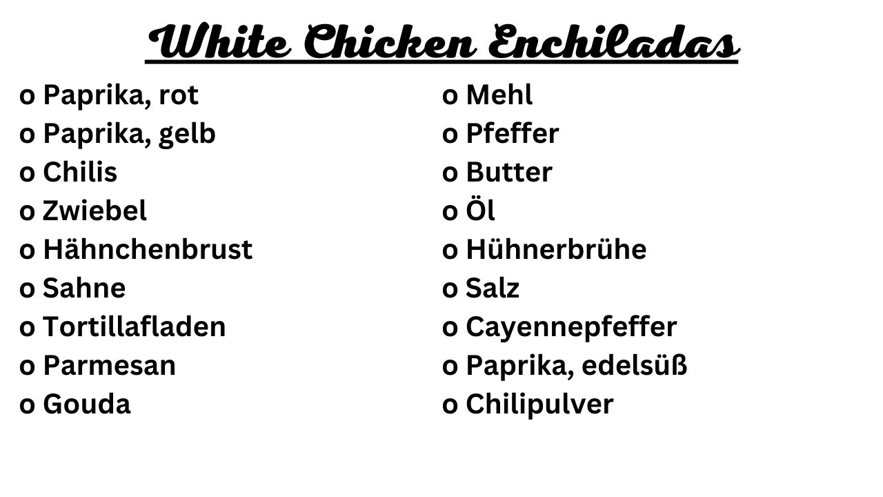Ein herzliches Willkommen auf meinem Blog, liebe Food-Enthusiasten! Heute nehme ich euch mit auf eine kulinarische Reise zu einem Gericht, das nicht nur die Geschmacksknospen verzaubert, sondern auch auf jeder Foodie-Bucket-Liste einen Ehrenplatz verdient: White Chicken Enchiladas. Diese himmlischen Enchiladas sind zweifellos eines der leckersten Rezepte der Welt und werden eure Geschmackssinne in ungeahnte Höhen katapultieren. Die Kombination aus zartem Hühnchen, cremiger Sauce und würzigem Käse macht dieses Gericht zu einem absoluten Gaumenschmaus. Wenn ihr auf der Suche nach einem Gericht seid, das eure Familie und Freunde gleichermaßen beeindrucken wird, dann seid ihr hier genau richtig! Lasst uns gemeinsam in die Welt der White Chicken Enchiladas eintauchen und herausfinden, warum sie auf jede Big Food Bucket List gehören.